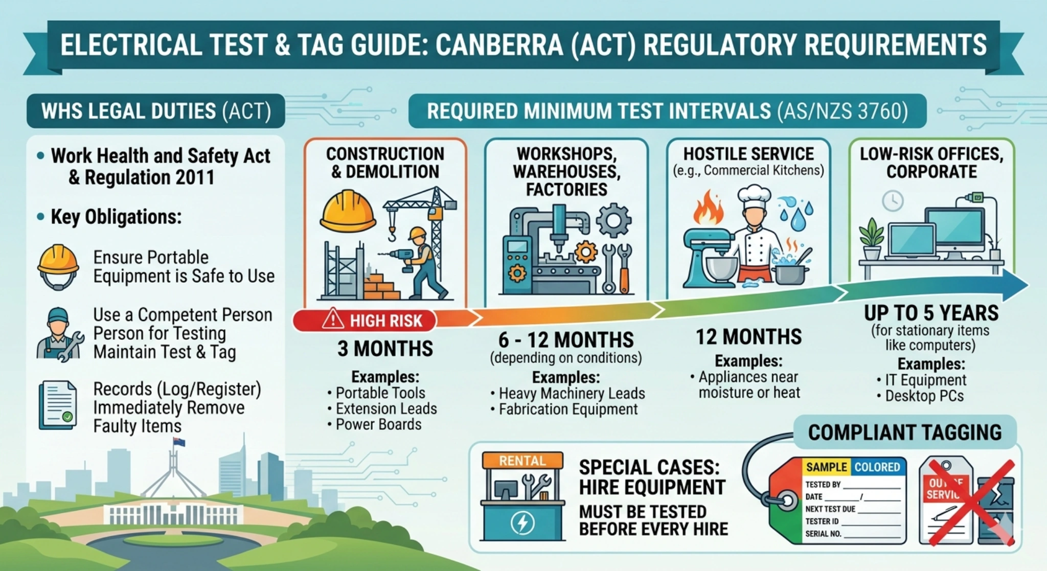 The ACT largely adopts the national WHS framework. That means the key requirements come from the Work Health and Safety Act 2011 (ACT), the Work Health and Safety Regulation 2011 (ACT) and the referenced Standard AS/NZS 3760, which sets out how often different types of equipment must be tested.